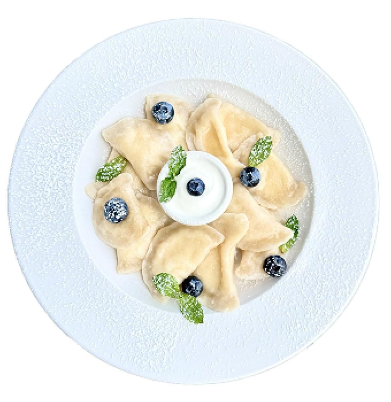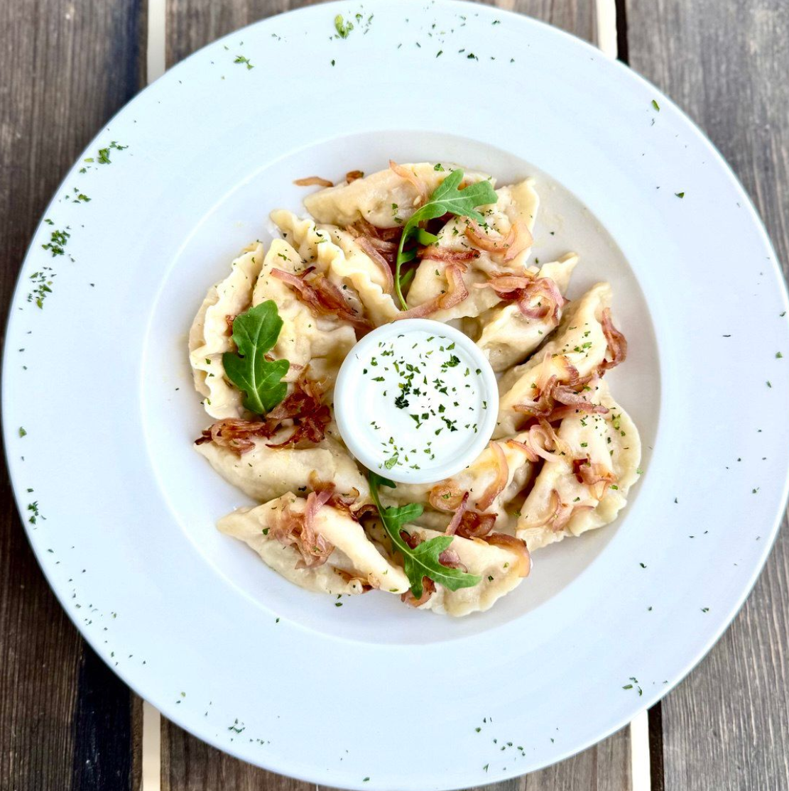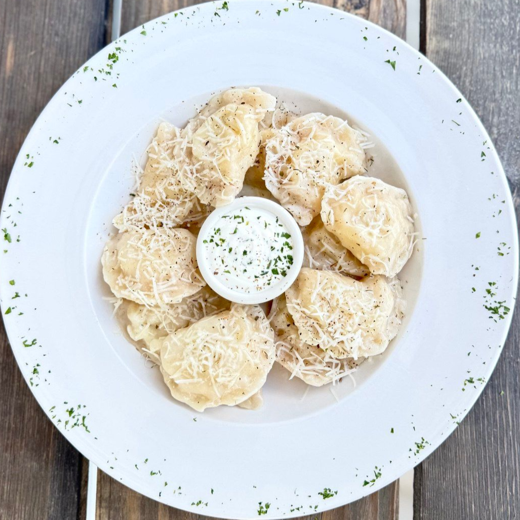 Handmade pierogies filled with creamy mashed potatoes and Greek cheese.