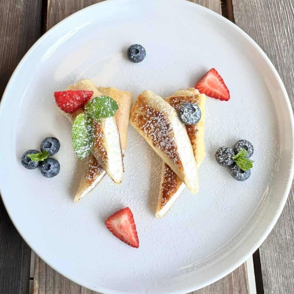 Thin, delicate crepes filled with lightly sweet farmer’s cheese.