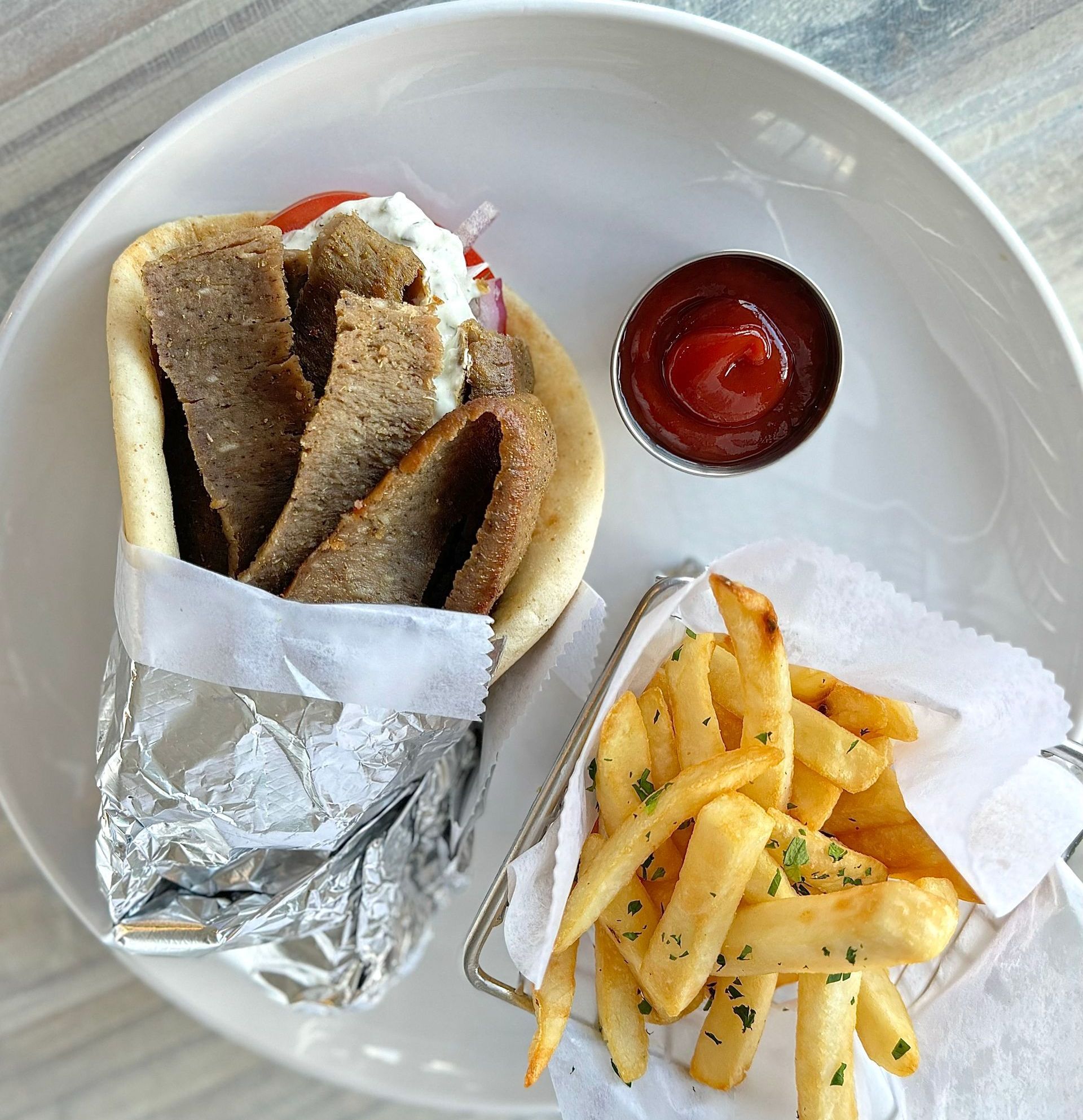 Flame-grilled gyro meat, (85% beef, 15% lamb) served with french fries or onion rings