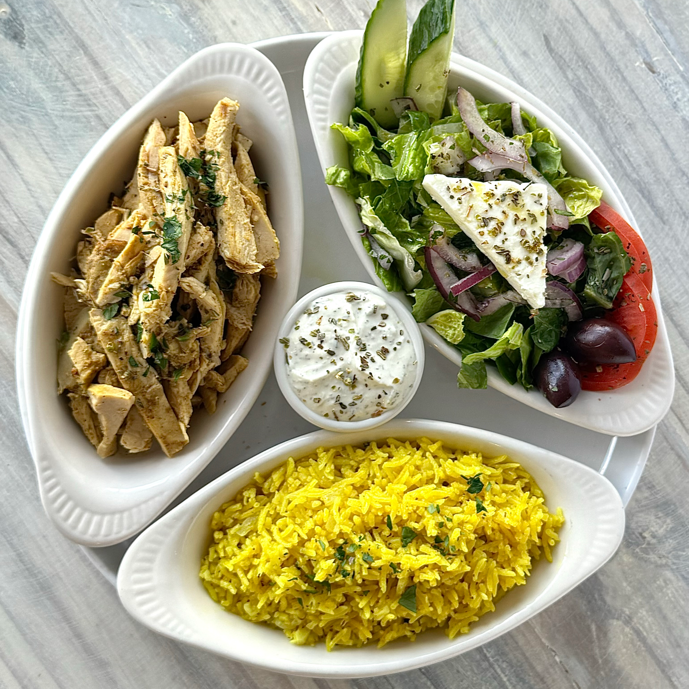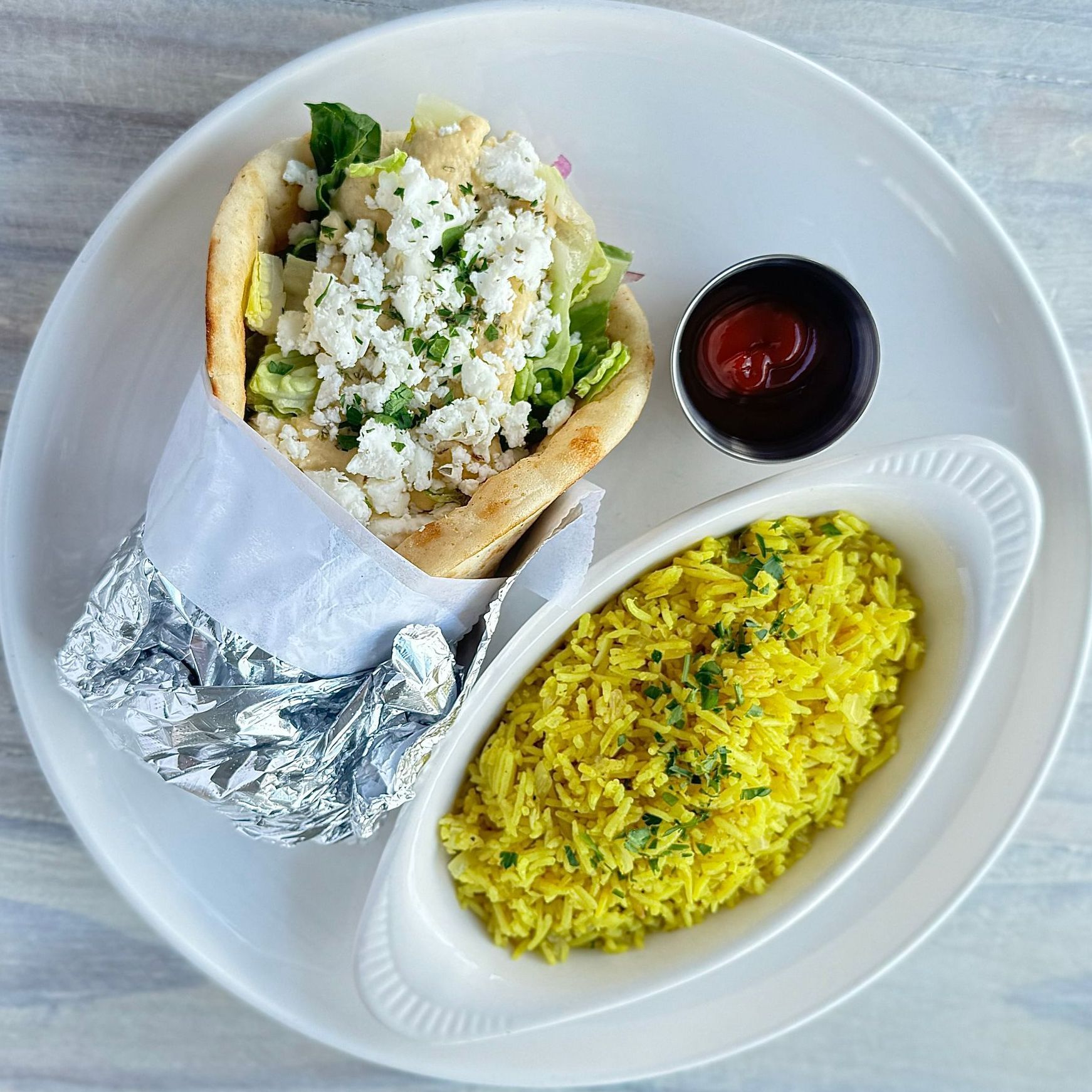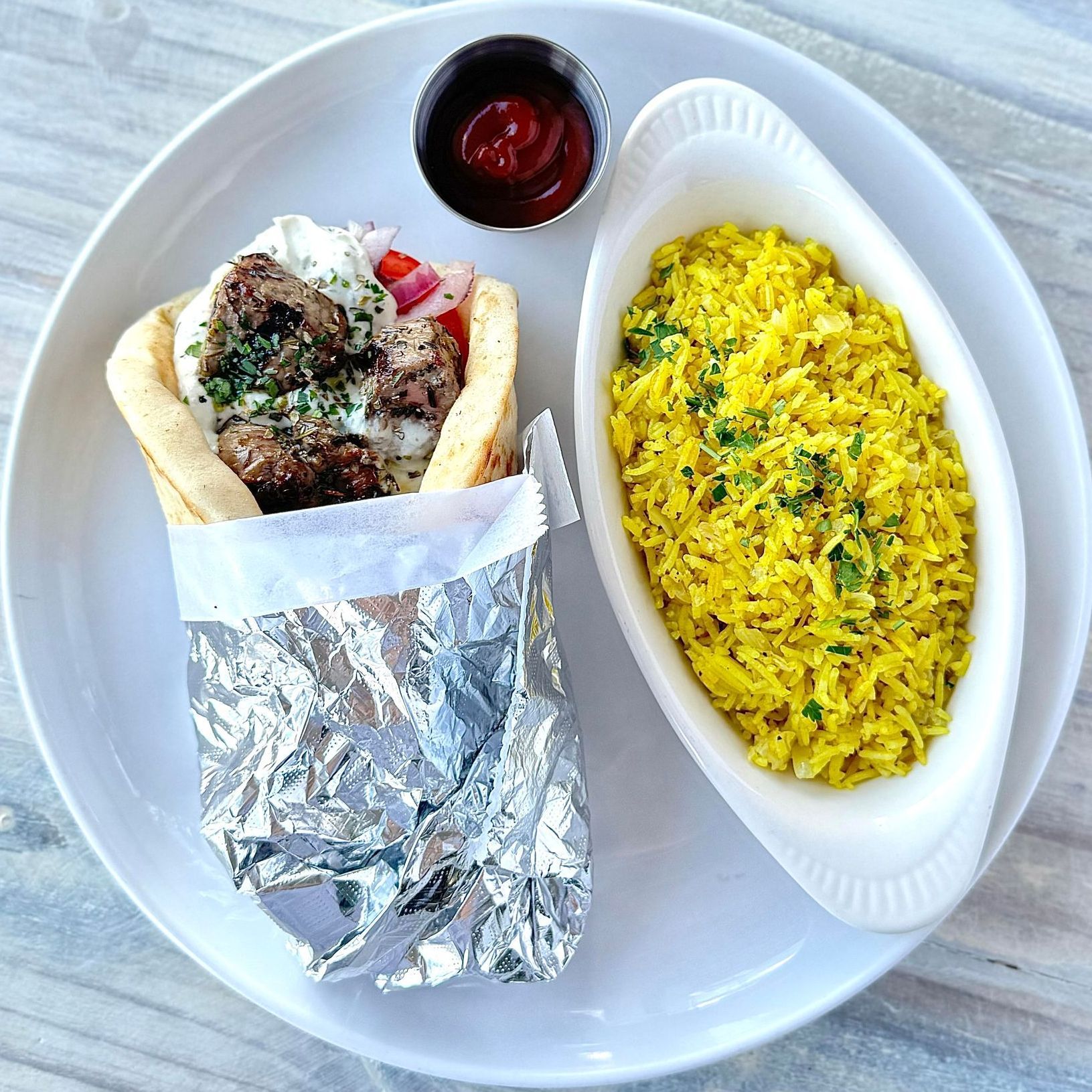 Lemon rice, salad, tzatziki sauce, and meat of your choice served over pita. You can choose: