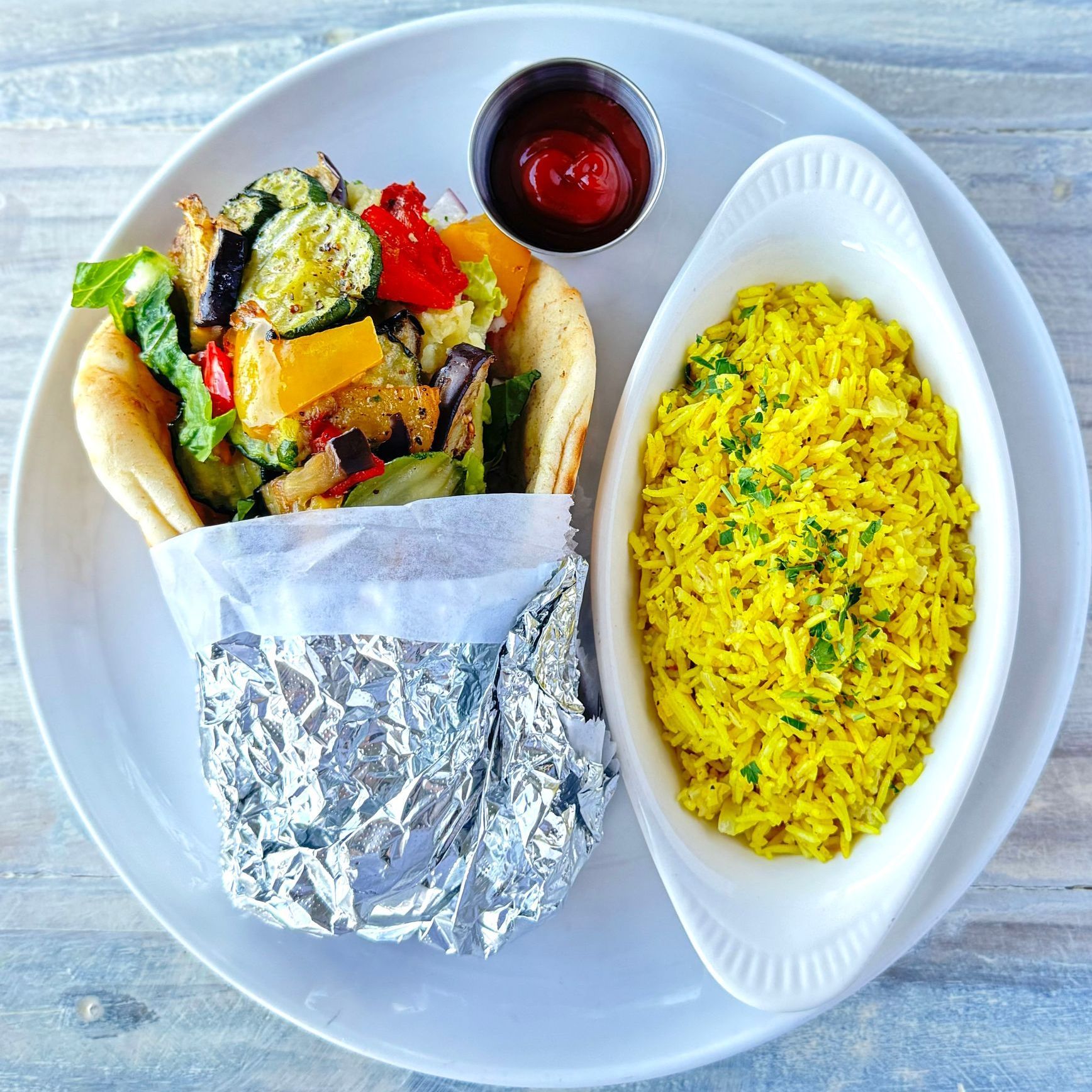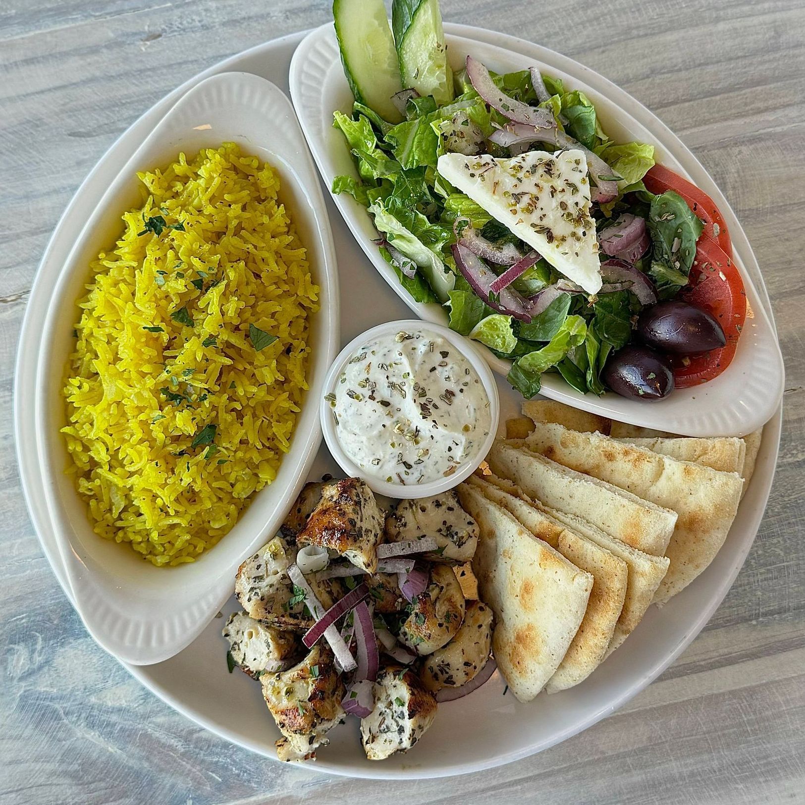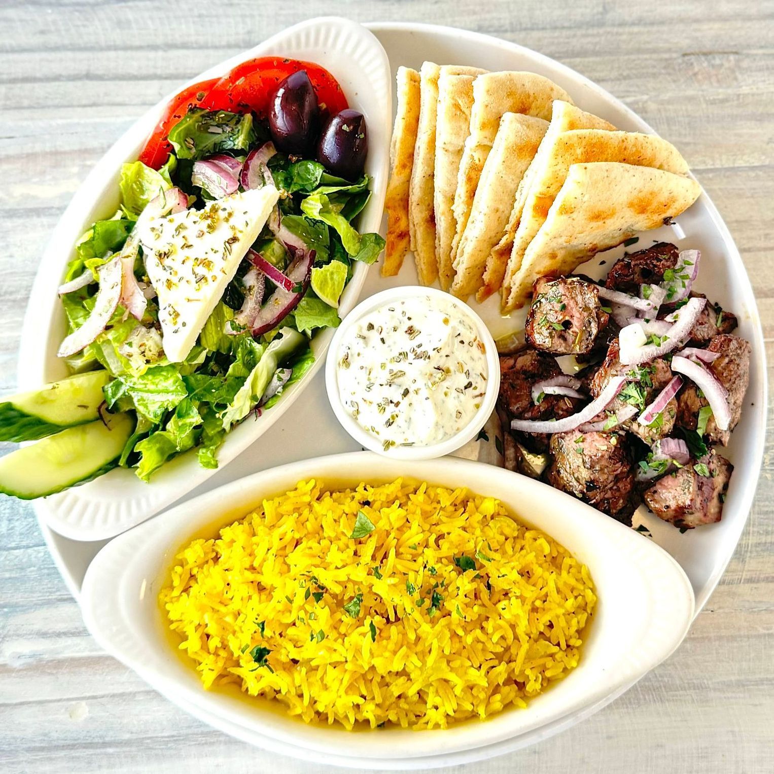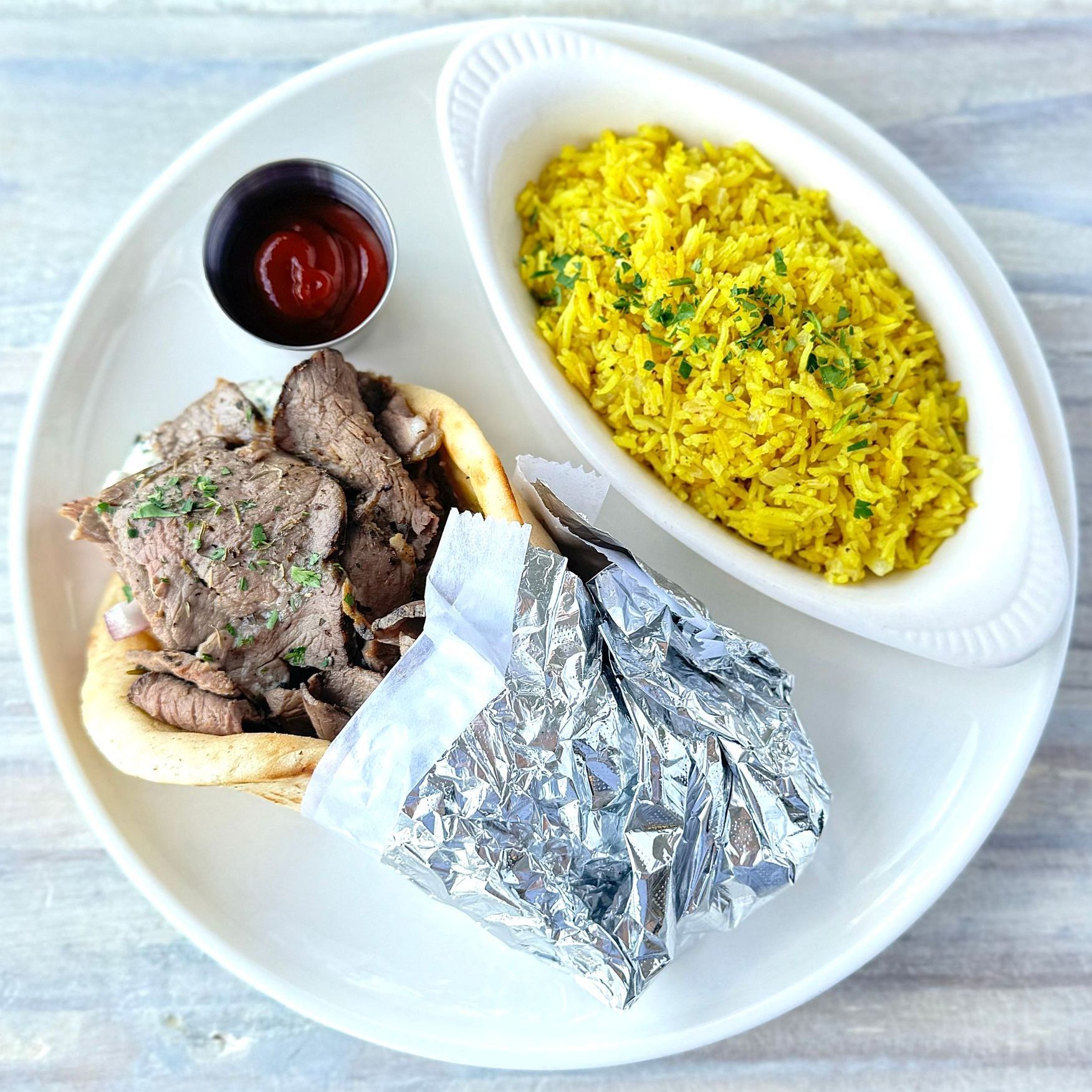 Lemon rice, salad, tzatziki sauce, and meat of your choice served over pita. You can choose: