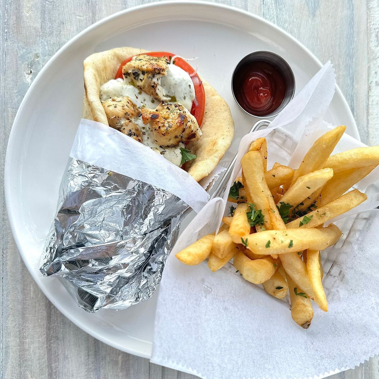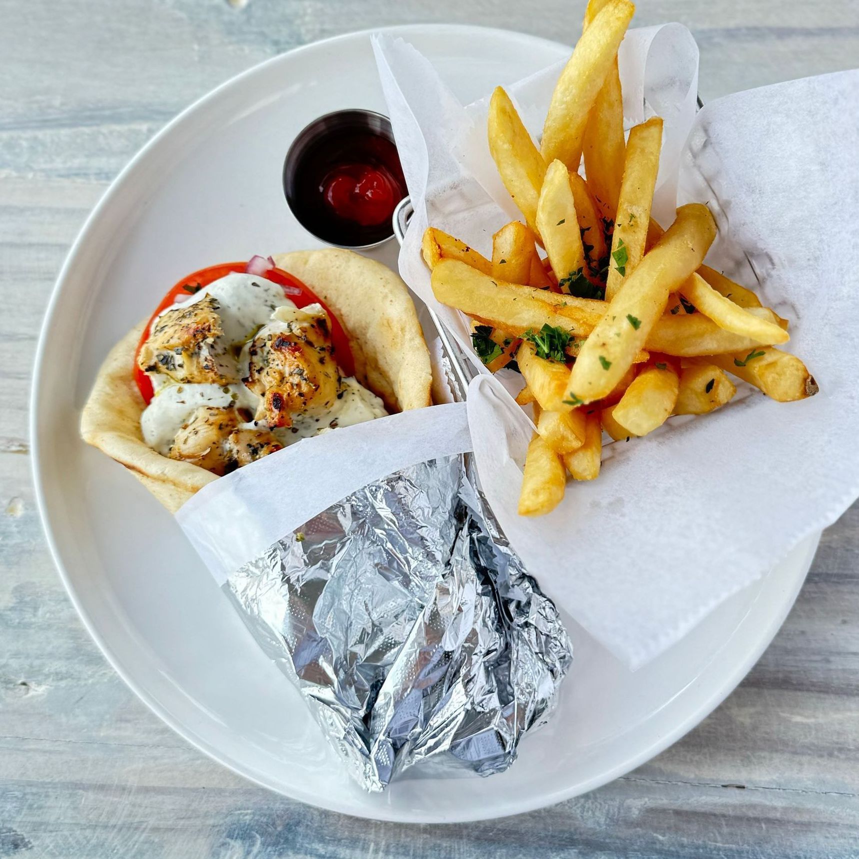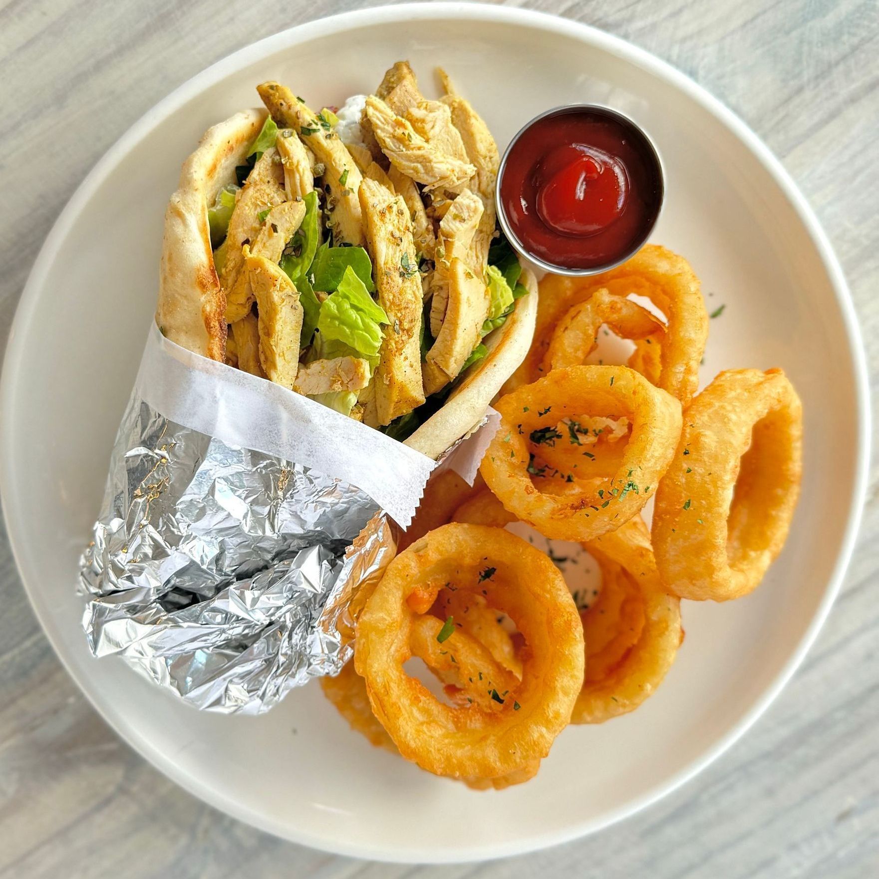 Middle eastern flavored chicken, lettuce, tomato, red onion and tzatziki.