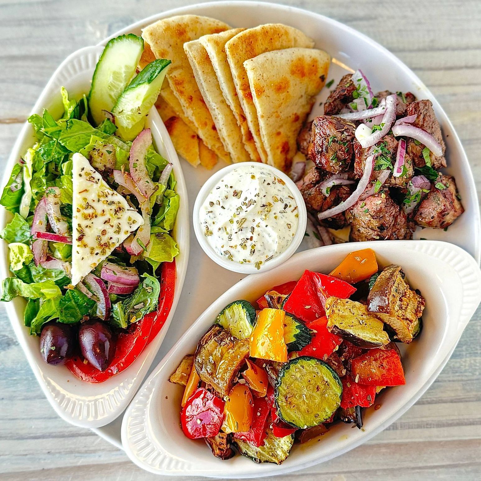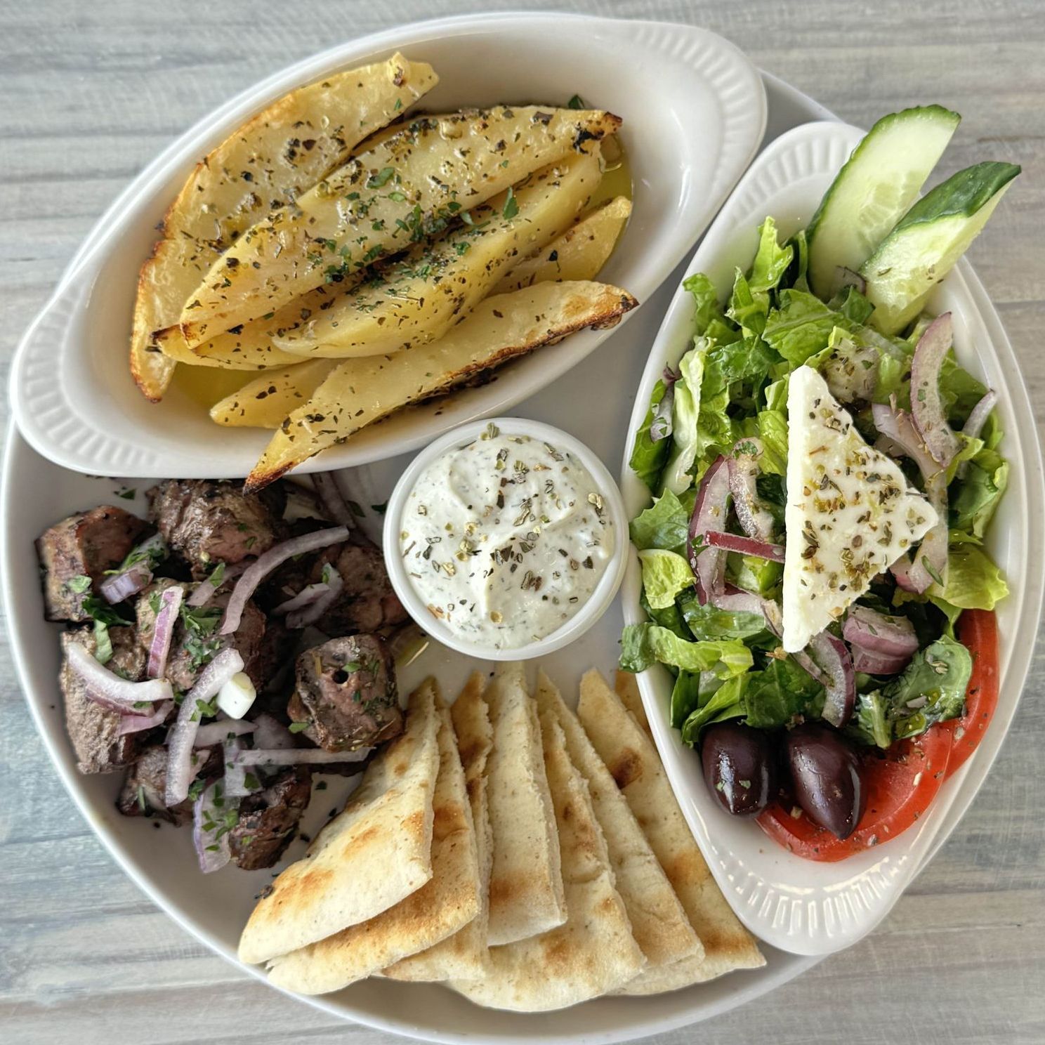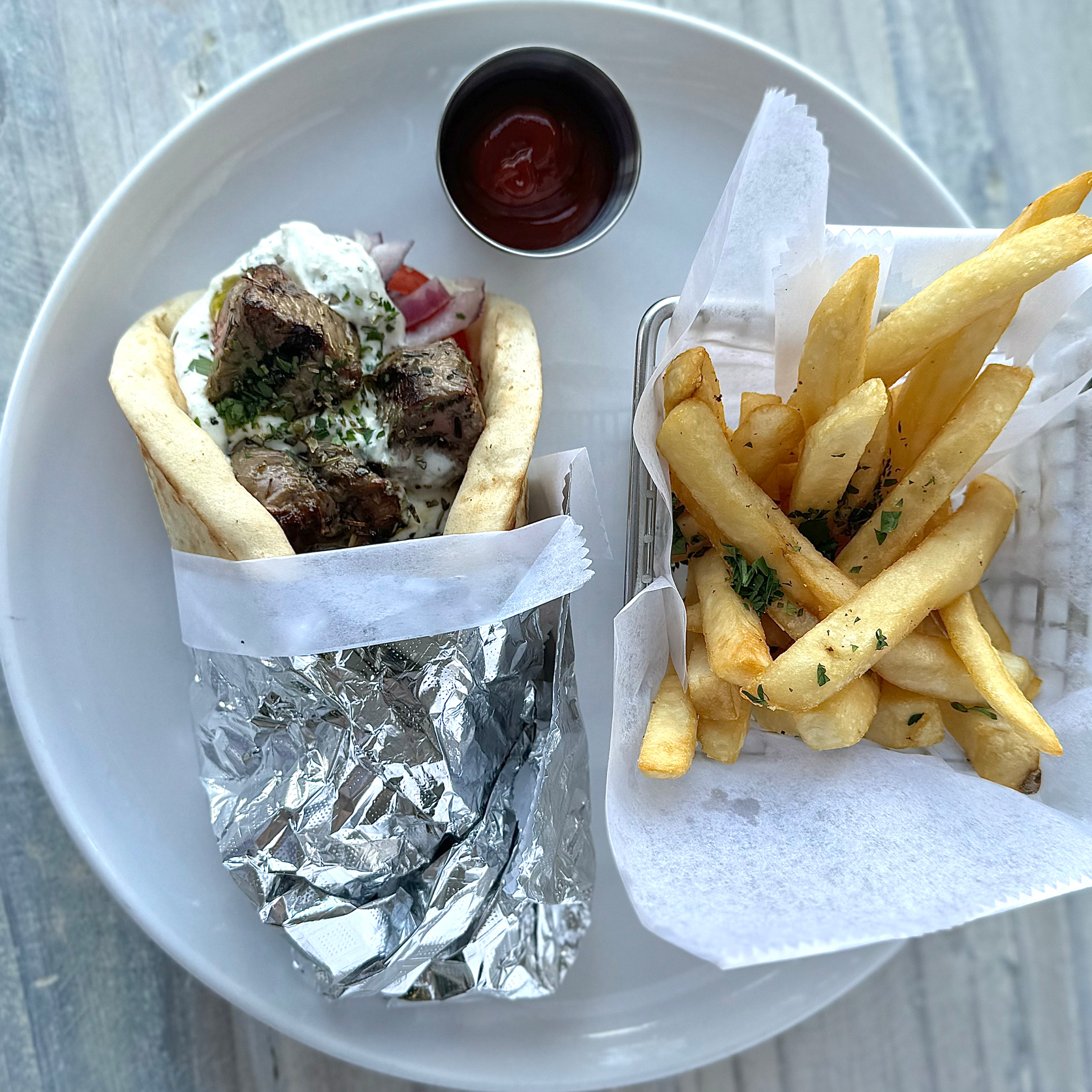 Grilled beef souvlaki, tomato, red onion and tzatziki.