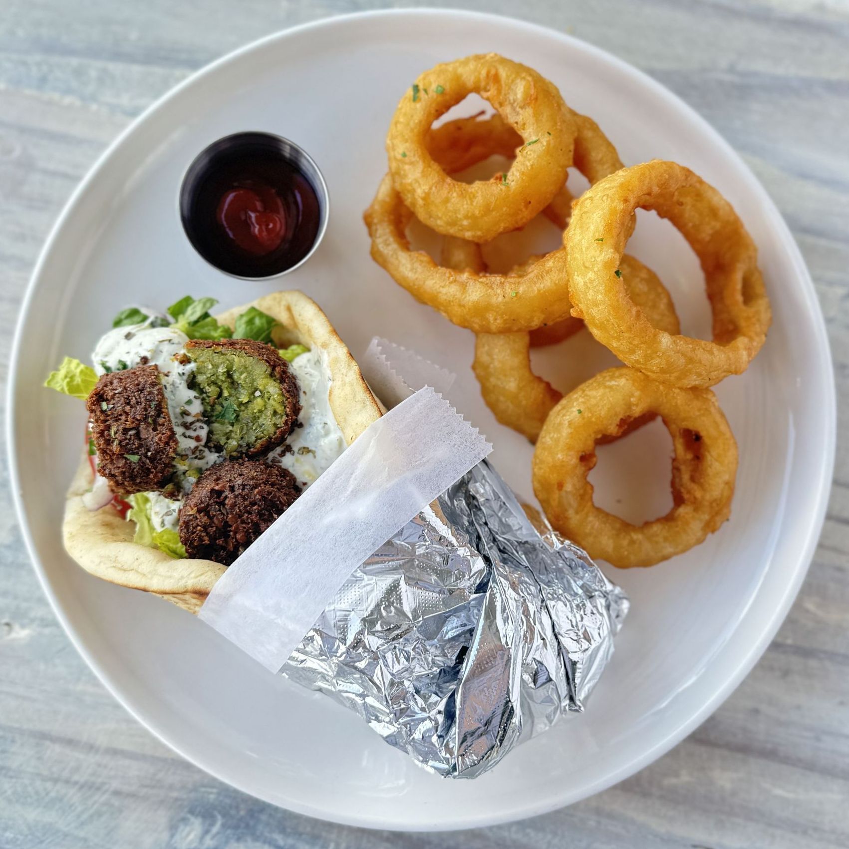 Romaine lettuce, falafel, red onions, tomato, oregano and a choice of tzatziki or hummus.