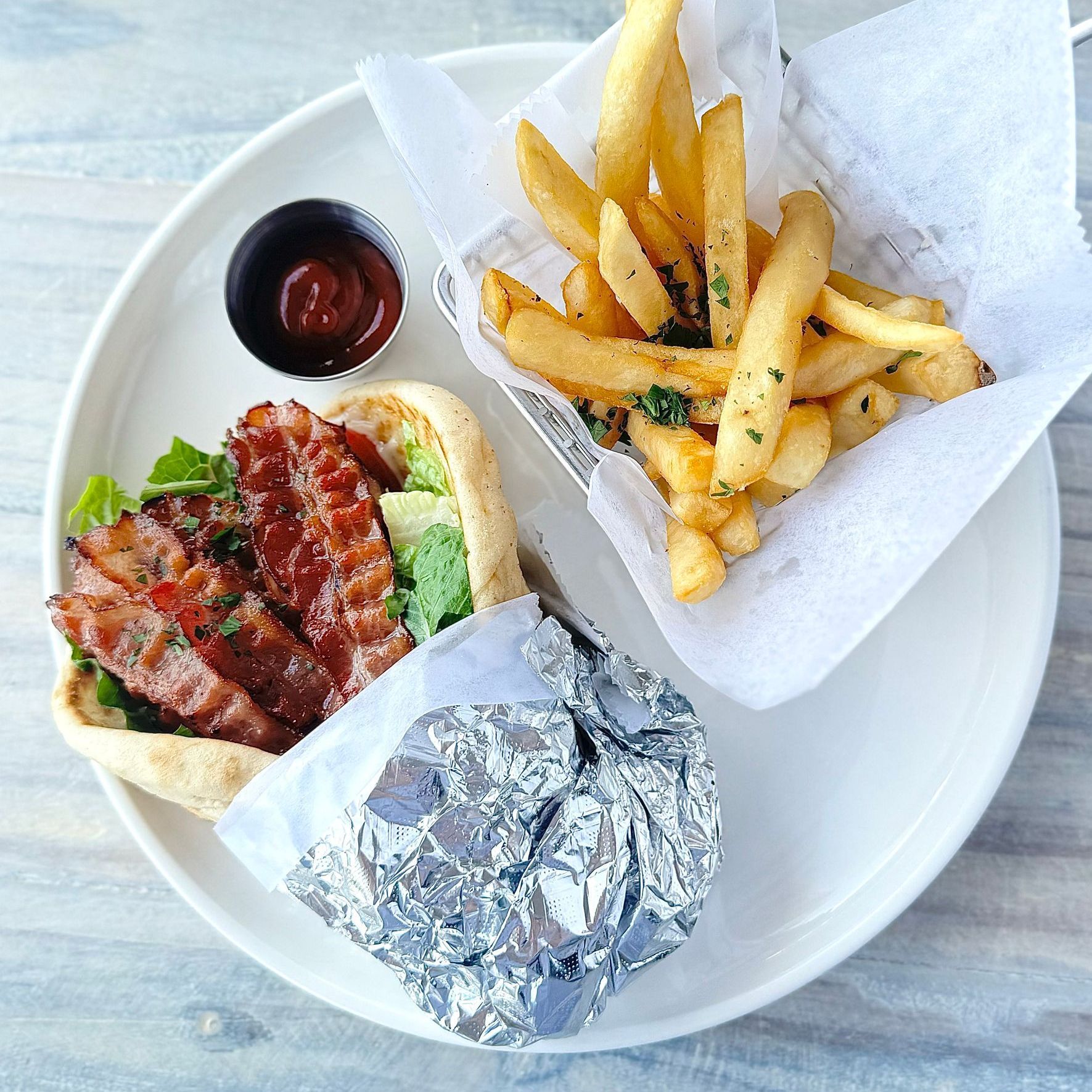 Flame grilled burger, tzatziki, bacon, onion rings, bbq sauce, red onions, tomato, melted imported Kasseri cheese with side of crispy French Fries.