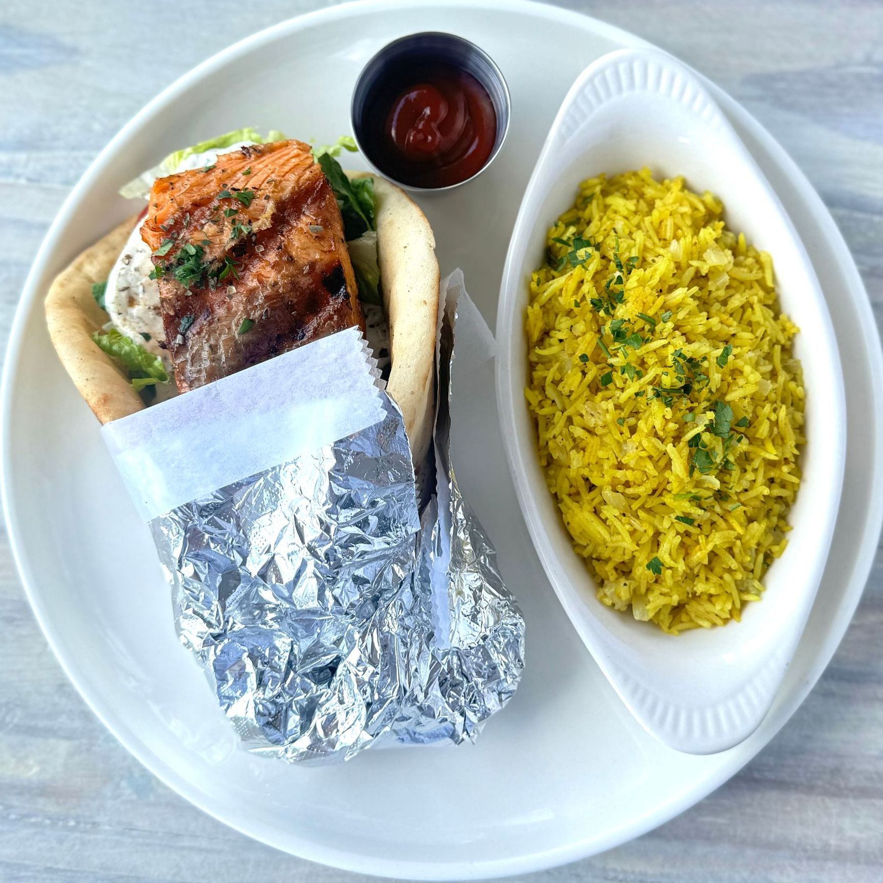 Grilled salmon in pita or Kaiser roll, lettuce, tomato, oregano and tzatziki.
