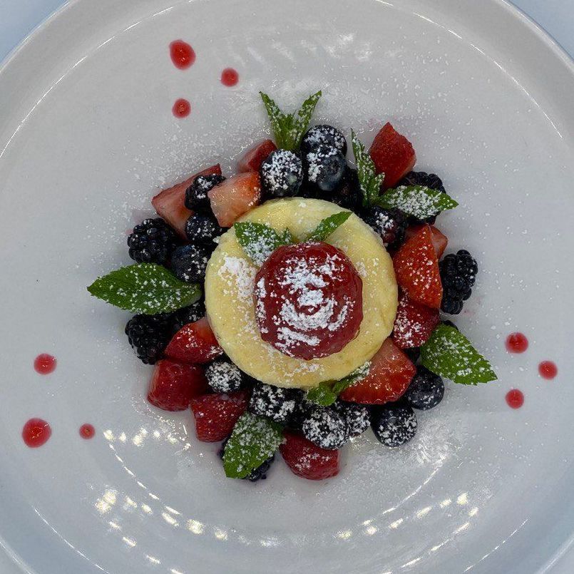 Creamy cheesecake topped with layers of phyllo & walnuts
