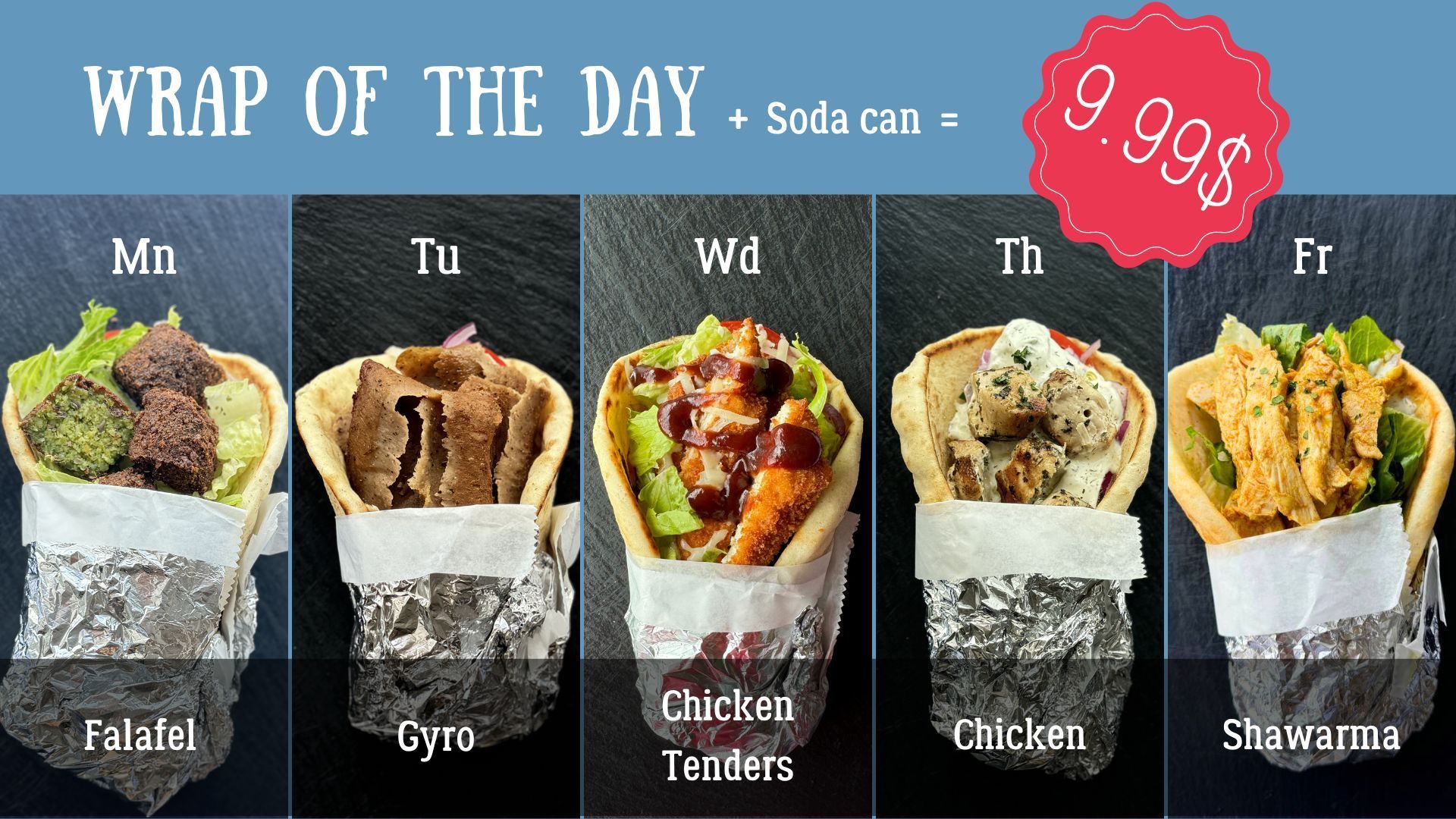 Every day of the week from Monday to Friday we offer wrap of the day with canned drink for 9.99$!